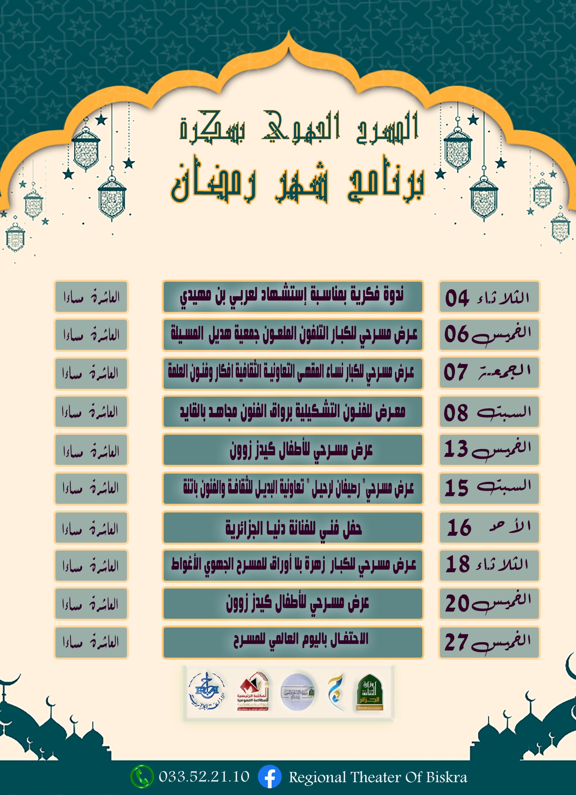 ✨ برنامج عروض شهر رمضان للكبار و الصغار   ✨ المسرح الجهوي بسكرة ينظم  باقة من العروض المسرحية الموجهة للكبار و الصغار بمناسبة الشهر الفضيل لا تفوتوا الأجواء الإستثنائية ! نحن بانتظاركم يمكنكم حجز تذاكركم في العرض المسرحي الذي ترغبون فيه بالضغط عليه من هنا