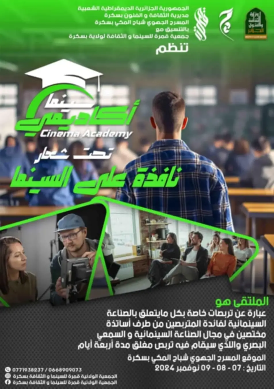 مُدِيرِيَّة اَلثَّقَافَةِ وَالْفُنُونِ لِوِلَايَةِ بَسْكَرَةَالمسرح الجهوي بسكرة Regional Theater Of Biskraبالتنسيق معجمعية قمرة للسينما والثقافة لولاية بسكرةتنظمسينما اكاديميتحت شعارنافذة على السينماايام 07 الى 09 نوفمبر2024بالمسرح الجهوي شباح المكي بسكرة